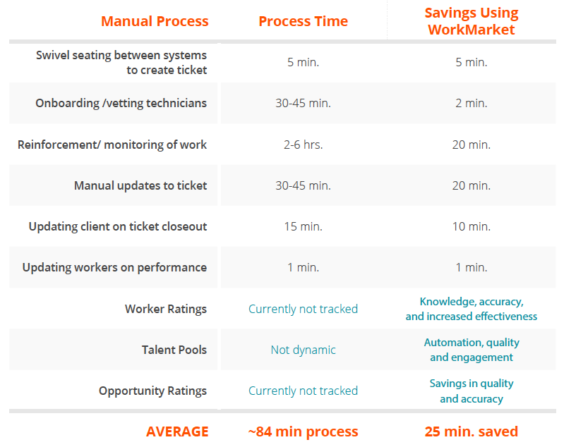 As you can see, the time these manual processes take is substantial. Likewise, the time savings with the automation of the WorkMarket solution is also substantial. More on that in a bit.