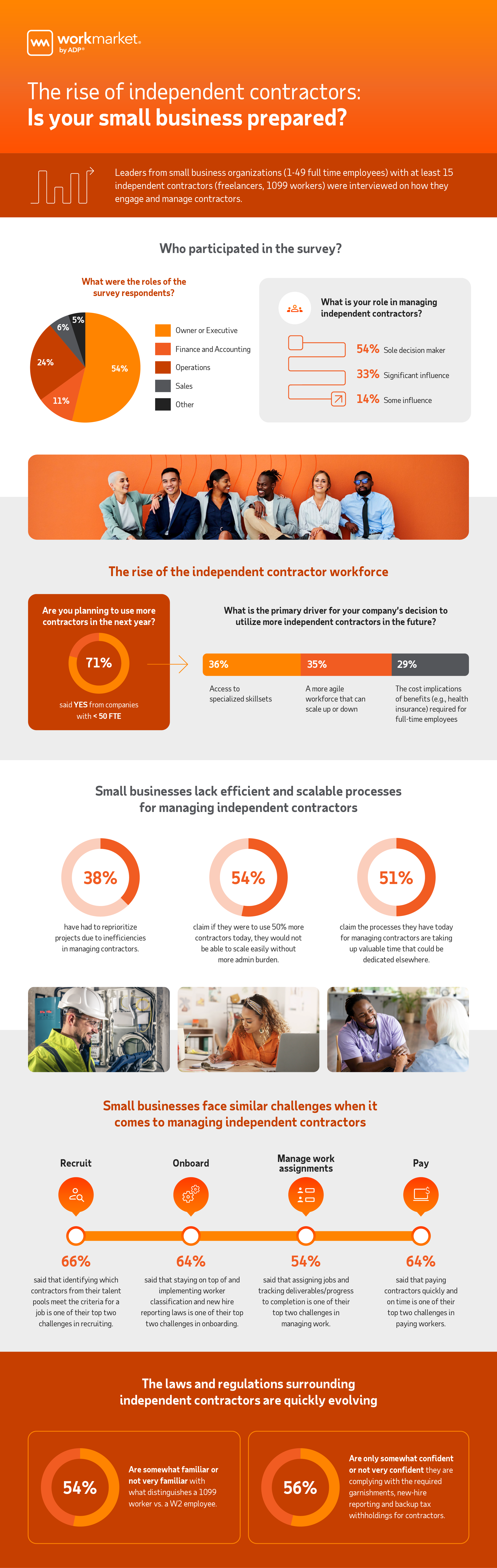 WorkMarket by ADP recently partnered with Worldwide Business Research (WBR) Insights – a world leader in industry-driven thought leadership conferences – to perform a survey to better understand how businesses are utilizing independent contractors (1099 workers, freelancers), and the challenges and opportunities they face. Eighty of the businesses surveyed were small businesses (1-49 fulltime employees), and you can see their highlights below.