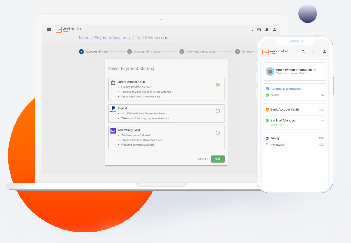 - Payment options for workers including ACH, pay card, or electronic payment services